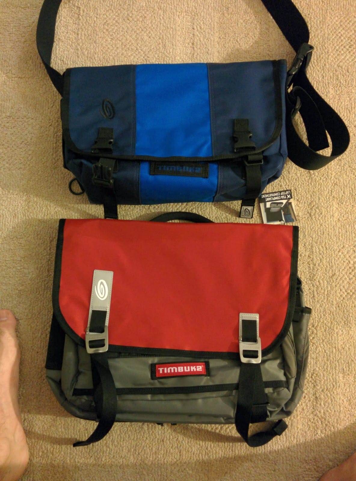 You may notice that there are two bags in that photo. That’s because I got a new Timbuk2 bag. I’m going all-in with this one. I sold my old Maxpedition bag and I’m giving my old (blue) Timbuk2 bag to Melissa.