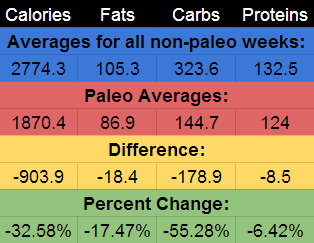 I think in a true Paleo diet, you’d be getting much fewer carbs than I did. You are supposed to limit the amount of fruit you eat - which I didn’t really do. I had fruit smoothies more than once a day on average. I expected my fat intake to go up, which it didn’t. I think that’s probably because I removed milk from my diet.