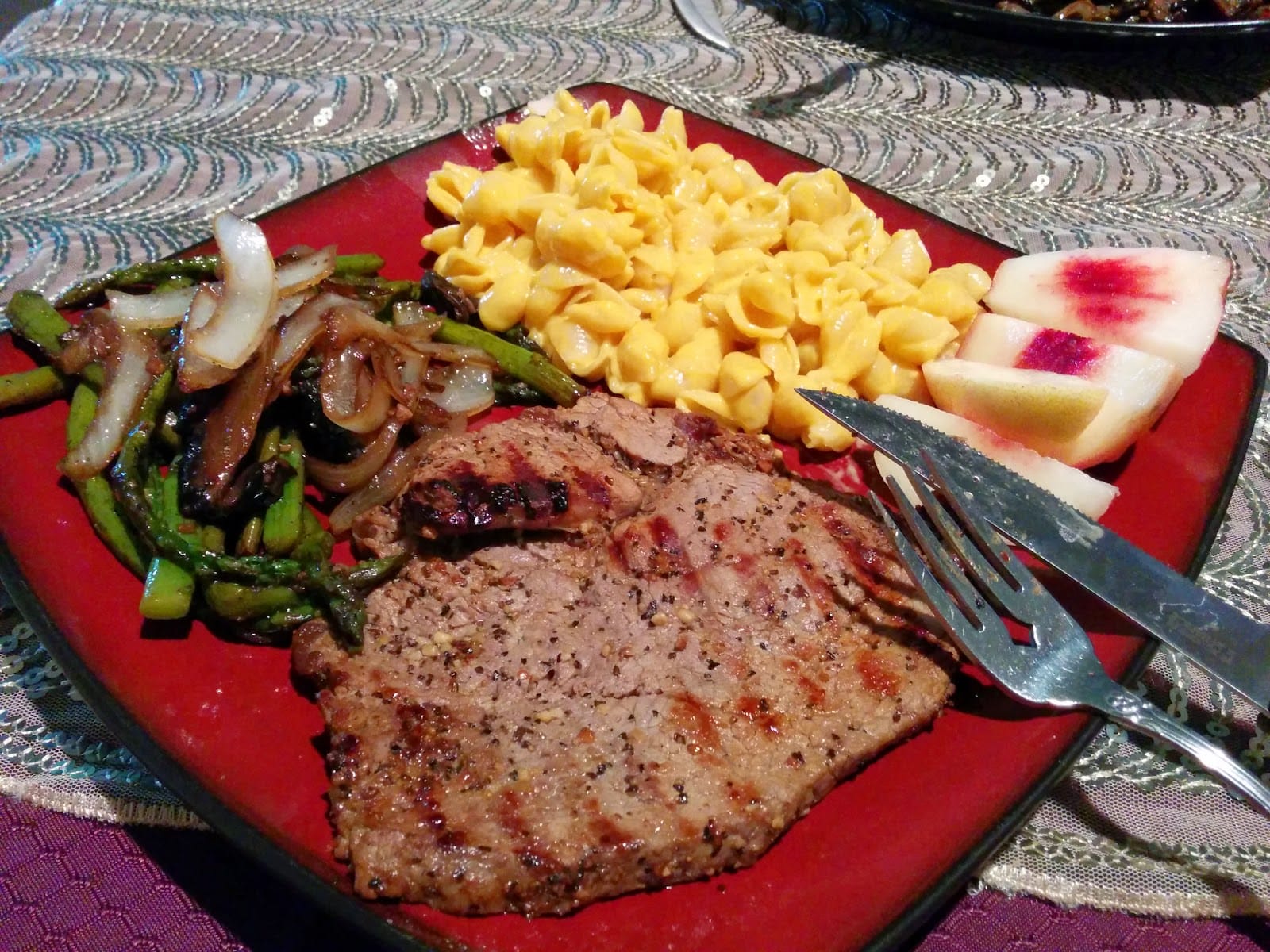 5. Steak, Asparagus, Onion, Mushroom, Shells and Cheese, and a Nectarine
