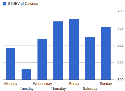 What does that chart show? Statistically, it’s showing the standard deviation of my calorie intake by day of week. What that means is this: I eat most consistently on Tuesdays for some reason. Friday has the widest variety of calorie totals.