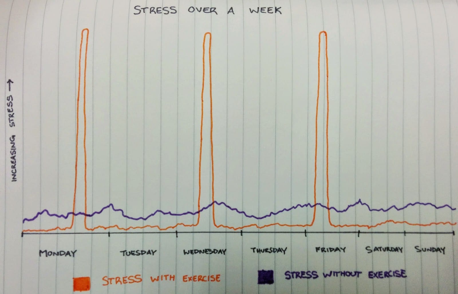 Obviously I put a lot of work into that. The overall amount of stress is represented by the total area under each line. If I drew it right, my theory states that the total amount of ink to fill the area under the orange line should be basically the same as what it would take to fill in the area under the purple line, the two possibilities yield equal amounts of stress. The person who works out, though, is much less stressed for the vast majority of the week. That’s the person I want to be. That’s the person I think I am.