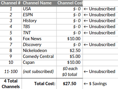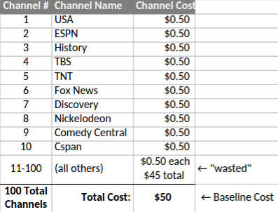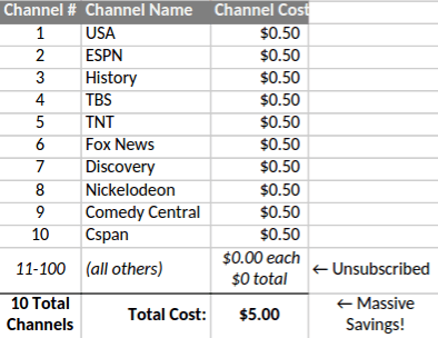 Millions of customers subscribe to a basic cable package that gives them 100 channels for $50/month. Let’s say that consumer XYZ watches somewhere around 10 of those channels in any given month. So, that she is wasting 85-90% of the money she’s paying, right?
