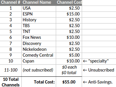 So let’s revisit example consumer XYZ. She still only watches 10 channels/month, but now it’s 9 “normal” channels and 1 “specialty” channel: