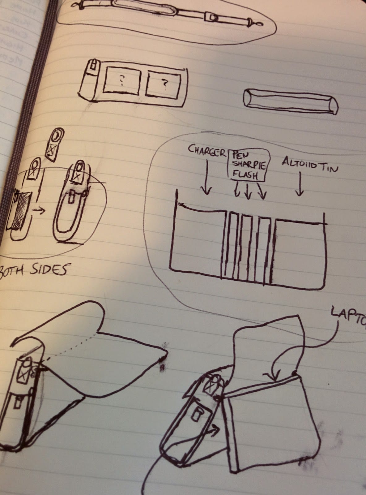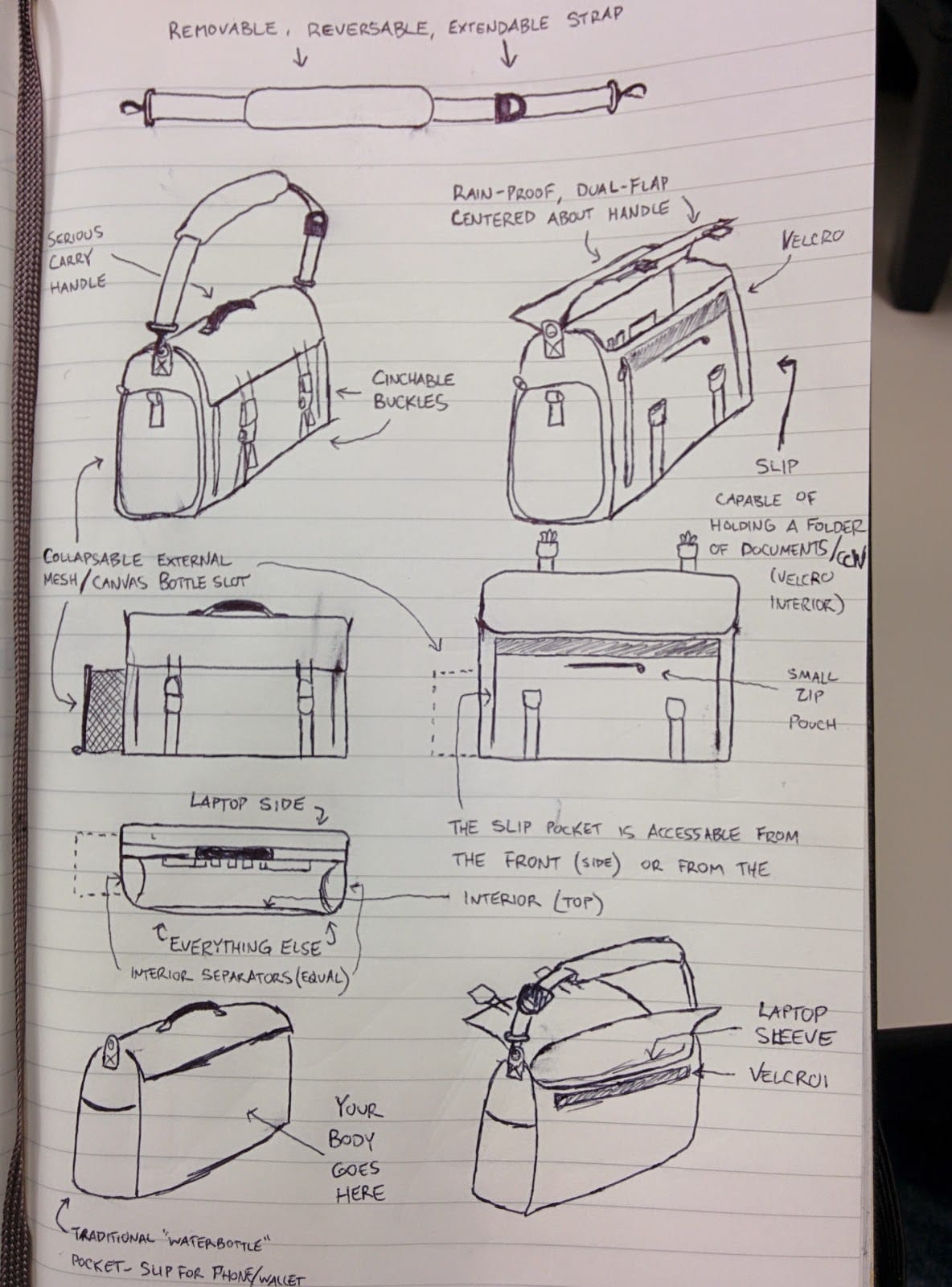 Friday when I was leaving work, I don’t remember exactly what I was doing, but I remember it involved my Timbuk2 bag and wanting to do something with it that it was not capable of doing (not capable in the capacity I wish it were, at least). It got me thinking “how would I change this bag to make it “perfect”. I got all excited by the idea to create a hypothetical “perfect” bag. I thought about it on and off all weekend.