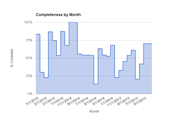 2. Completeness! A “completeness” metadatum is now included. This automatically added figure is a measure of how “sloppy” I’ve been with recording things. This feature is actually much larger value-add than I anticipated. It tells me that I tracked 45% of 2013, 61% of 2015, and 59% of 2015 so far. I expect those completeness figures to go up now that missing a single day’s worth of any one point doesn’t kill all points for the entire week.