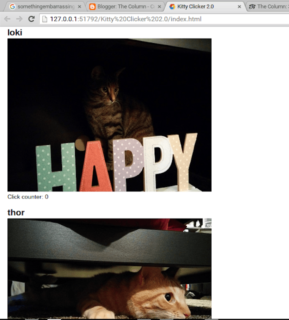 Udacity has been a really fun way to prep for grad school. Following along with the “JavaScript Design Patterns” course I’ve built a more and more robust version of the “Kitty Clicker” page.