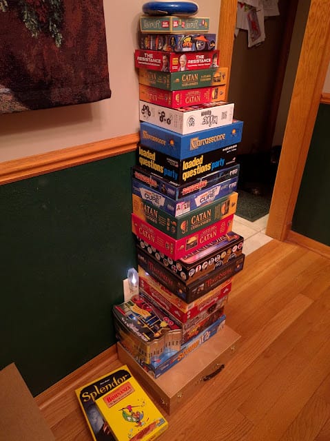 This is the stack of boardgames we played over the holiday. It does not include Ticket to Ride: Europe, Qwirkle, and the regular playing cards.