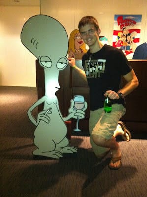 - Sharon is a character designer at Family Guy (not pictured) also, sometimes American Dad (pictured!). Side note: The bottle I’m holding is carbonated water. Apparently that’s a thing there. I don’t get it.