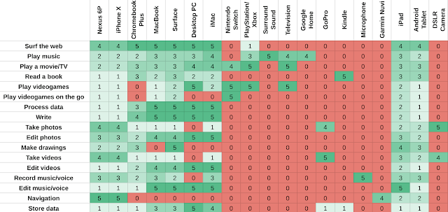It started with a thought exercise with where I tried to map out all of the use cases commonly covered by consumer electronics, rate (from 0 to 5) how well a bunch of different types of electronics enabled you to meet those uses, then try to find some optimal minified subset which adequately covered all the bases I care about.