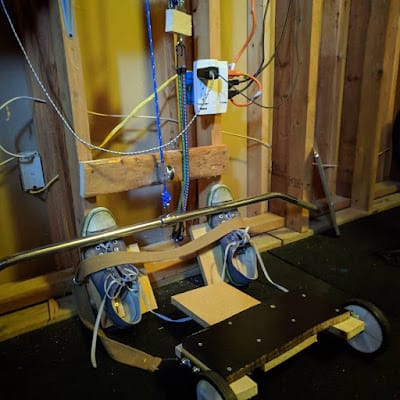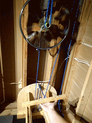 Turned out, though, that the bike wheel being parallel with the ground cause the chain to slip off the teeth of the freewheel. Also - the bungee cord-based rope retraction system was limiting the stroke length of the row. So - I abandoned the self-contained, bungee-cord-based system. Built it back into the wall. Fan wheels. Weights for retraction. AAAAAAAAAAAAAND