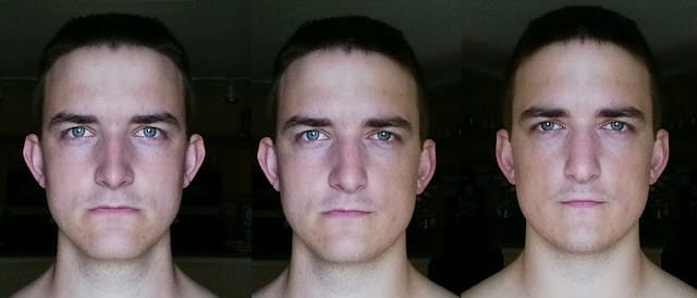 Ideally, all three faces up above should look basically the exact same. Differences between the three indicate differences between the two halves of the face. I, for example, have a fair amount of difference between the three photos. I’m not terribly asymmetric, but definitely not perfect.