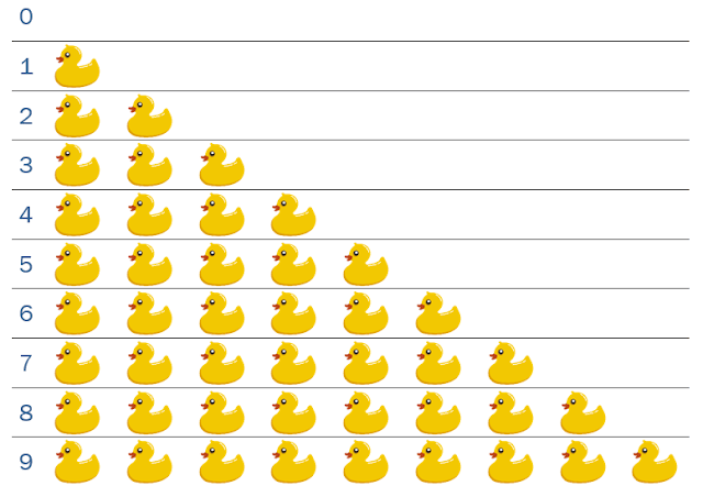 Each line of ducks has one more duck then the line before it because each number is one bigger than the number before it. The first number is zero. Zero means you have no ducks. Zero is a strange concept that comes into play when you want to count numbers bigger than nine.