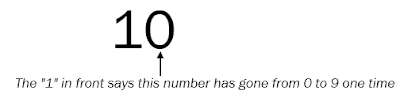 We decided we didn’t want to have more unique symbols to represent numbers than we have fingers on both our hands. Luckily, we figured out a way to count higher than 9 using only the symbols 0, 1, 2, 3, 4, 5, 6, 7, 8, and 9. Once you count up to 9, instead of going higher, you go back to 0, but you put a “1” next to the zero to make “10”.