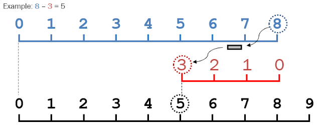 Like addition, you make a number line for each term, line up their ends. The number line for each number with a minus sign in front of it goes backwards. Then see where they line up. Subtraction is just repeated counting, where sometimes you count in the other direction.