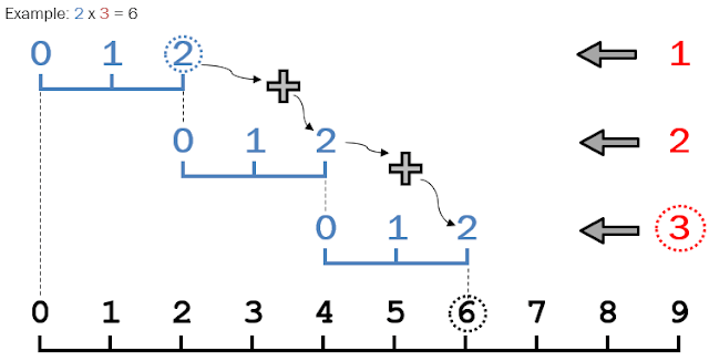 Multiplication is just repeated addition. You add one number to itself over and over, counting the number of times you do it, until you count to the other number. Then you see where you end up.
