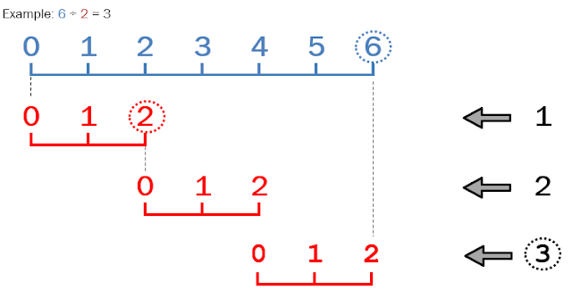 Division is also repeated addition. You start with the first number, then add the second number to itself, counting the number of times you do it, until you get to the first number. For division, the answer is the number of times it took adding the second number to reach the first.