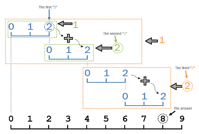 Even exponentiation is counting. Repeated counting is called addition. Repeated addition is called multiplication. Repeated multiplication is called exponentiation. This is more complicated, and you shouldn’t expect to understand this until later on in school. To show how it works, we need to use a more complicated color scheme.