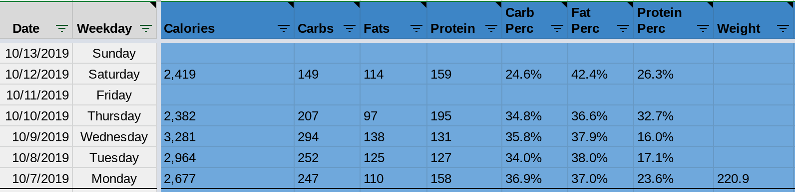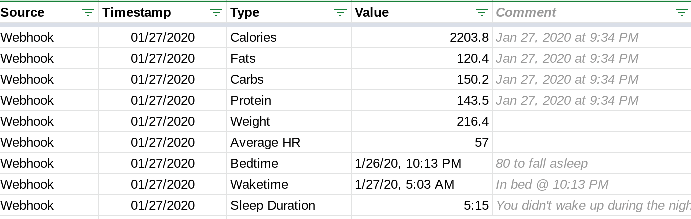 Since the Life Tracker started in April, 2013, it was structured as a standard spreadsheet. Rows and columns. Each row was defined by a given period of time (day/week/month/year, depending on the sheet) and each column was associated with exactly one tracked data type, given by the column Header.