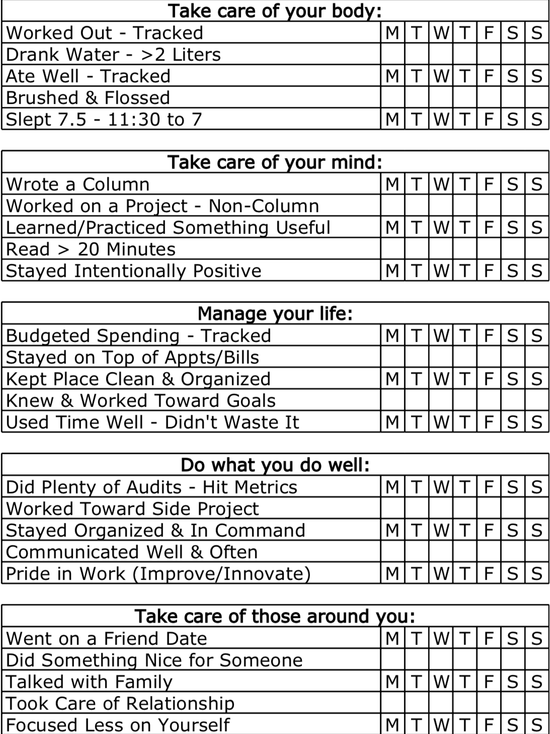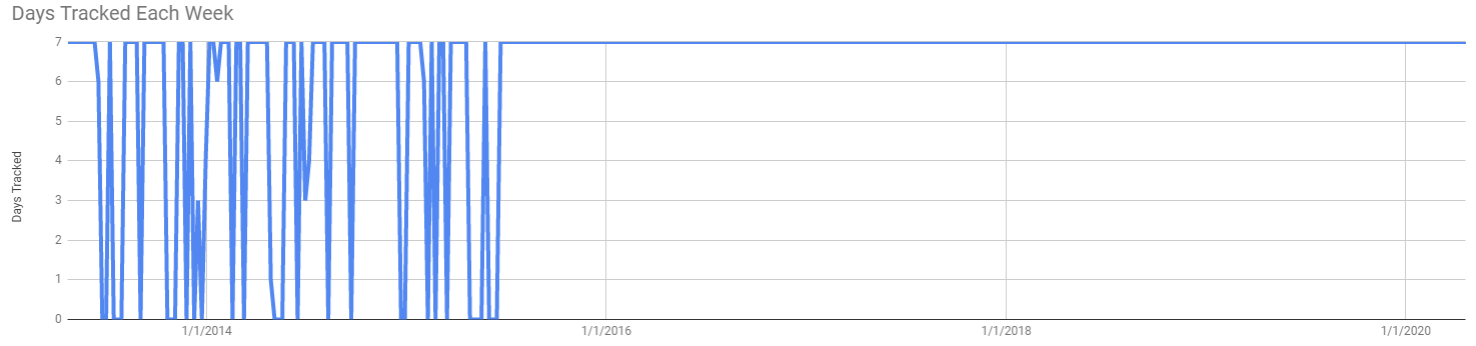 - 35 of the first 114 weeks were actually NOT tracked. Before I switched to a nightly input, if I lost the sheet of paper I was using to keep track of my week, it was a lost week. This is a 10% miss rate over the course of 7 years. Since the switch to the nightly input 4.8 years ago, I haven’t missed a day.