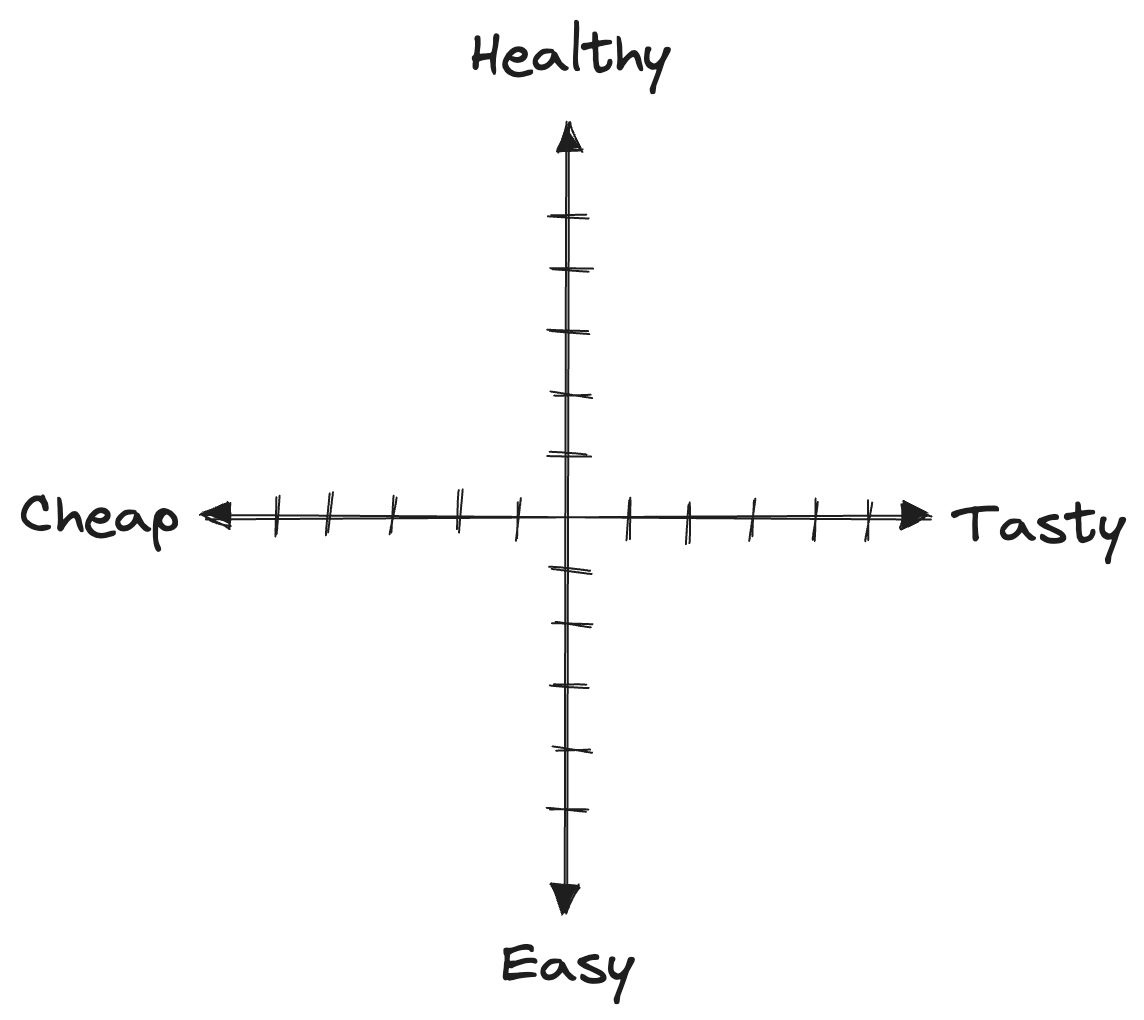 It’s an impossible task to maintain high marks across all four dimensions over time. The best thing you can do is try to balance which dimension(s) you’re sacrificing for any given meal or snack. Eat at an expensive but healthy restaurant one day, then have bagged popcorn the next. Make yourself a full meal from scratch later. Then eat a simple but bland salad.