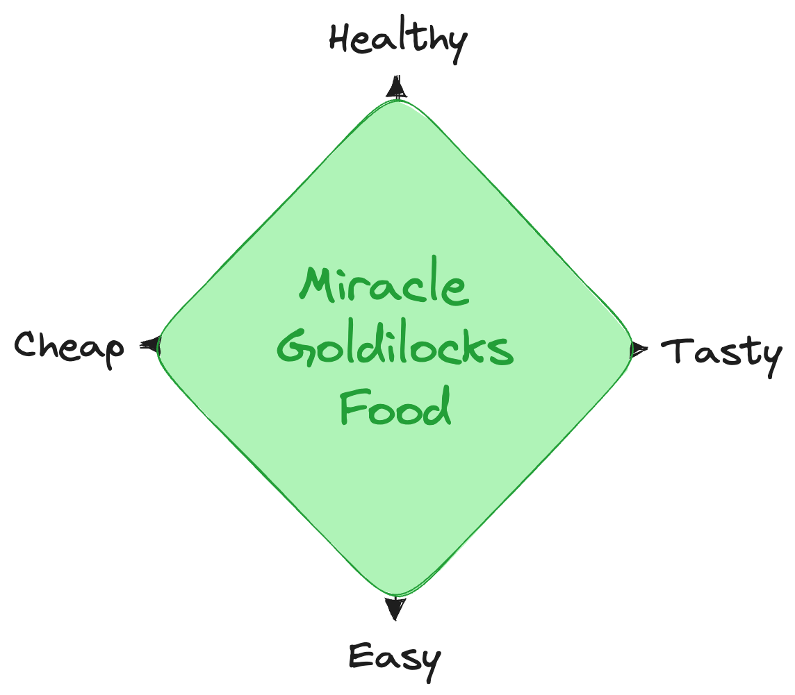 If things were easy, there would be some sort of miracle Goldilocks food that maxes out every single dimension: