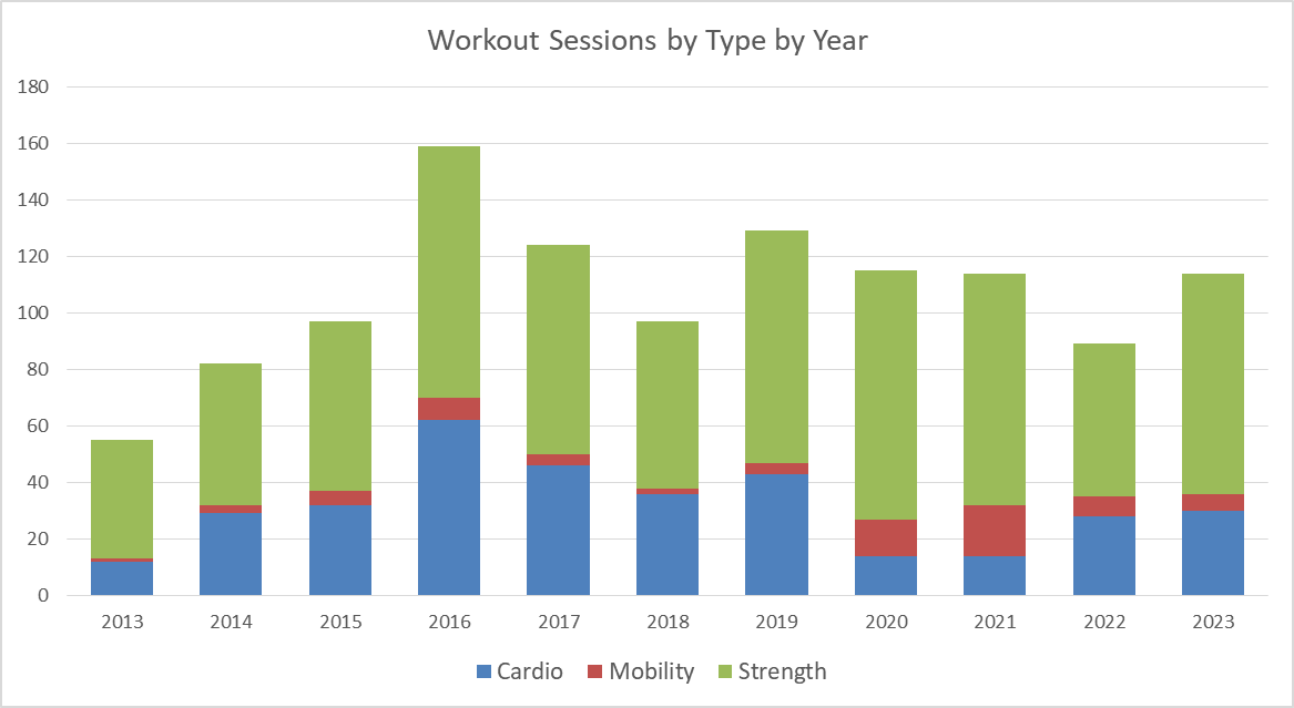 My interest in exercise jumped hard from 2015 to 2016, but aside from that has more or less stayed pretty consistent. I took up more yoga in 2020 and 2021 to make up for the lack of sports during the pandemic. I’m happy to say that the 2023 line is on pace to rival 2016 for my most active year.
