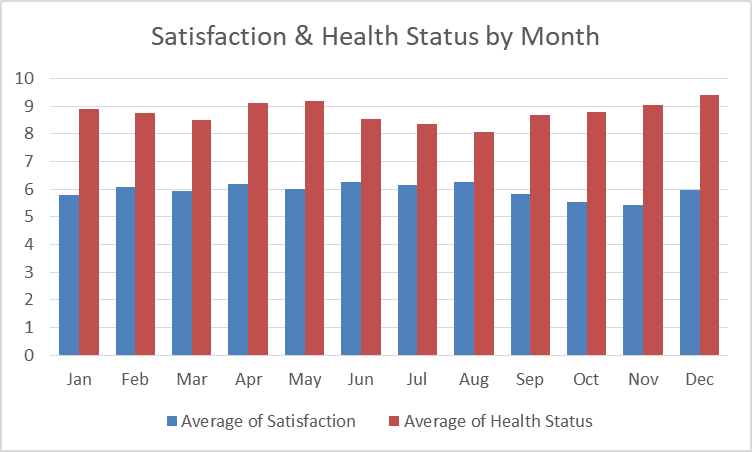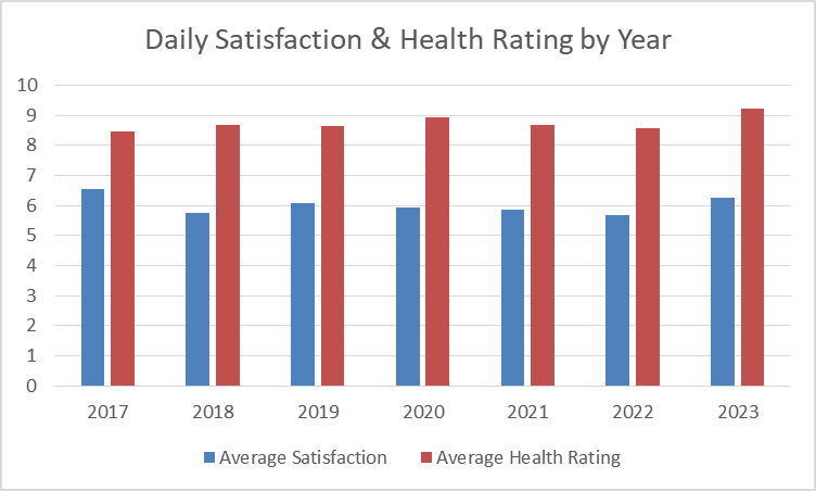I do, however, have something to share. Each night I also rank how satisfied I was with the day on a scale from 1 to 10, and how my current health is doing. It’s probably the work of The Hedonic Treadmill, but my daily satisfaction rankings have not changed much since I started capturing them.