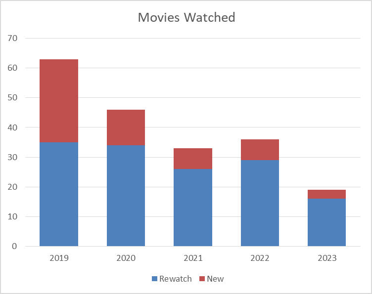 My movie watching has died off since I started tracking. I used to watch a movie every 5 days or so, now I’m down to a couple times a month. This includes Netflix and Video-on-Demand type movies, but does not include movies I put on for my kids to watch that I’m not really watching. My re-watching of movies I’ve already seen before has gone waaay down.