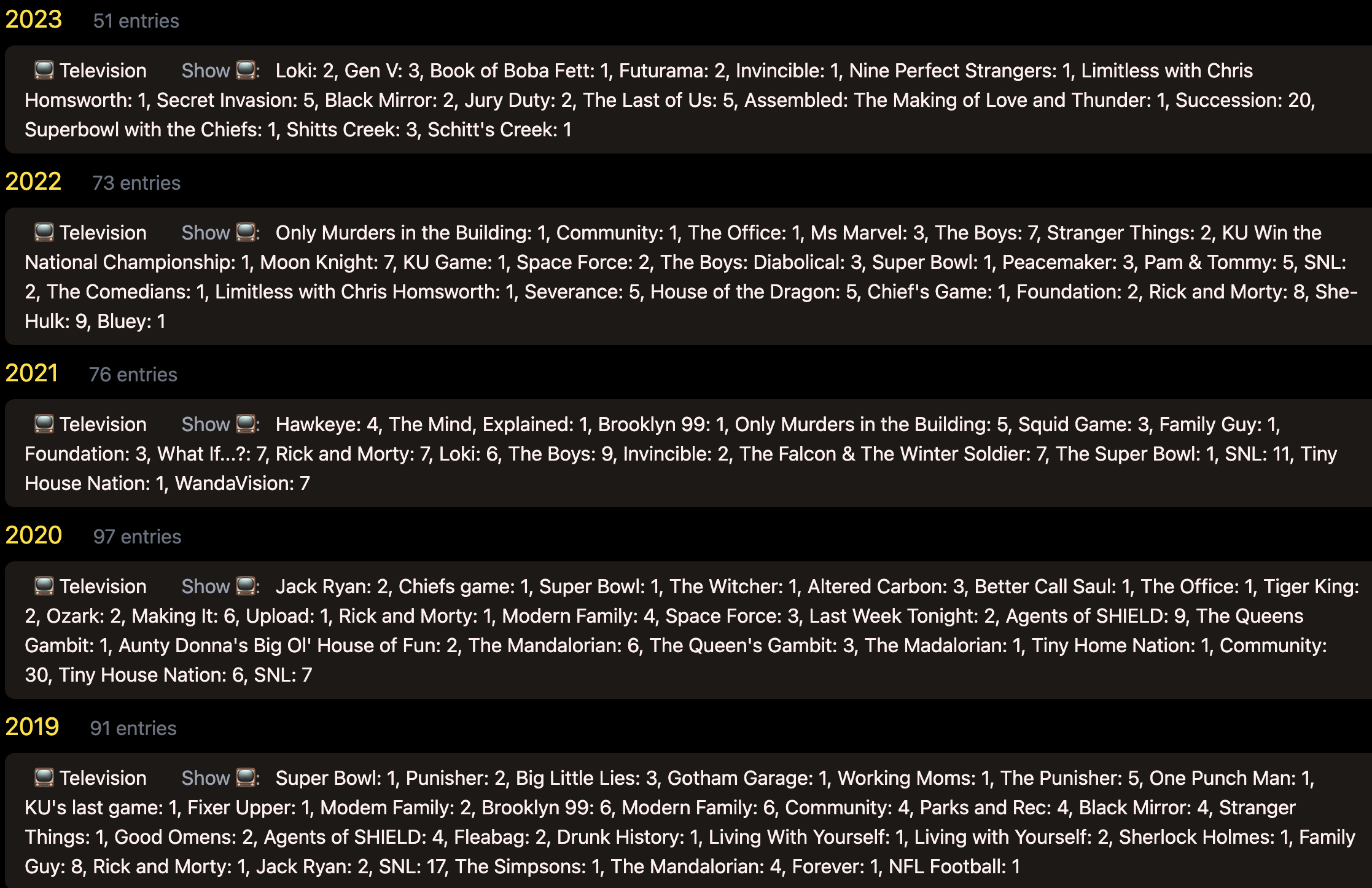 Tracking media is a large part of the reason I wanted to start tracking things that happen might happen multiple times per day. While I don’t have a decade of data for these, I do have 5 years. Which is still a ton.