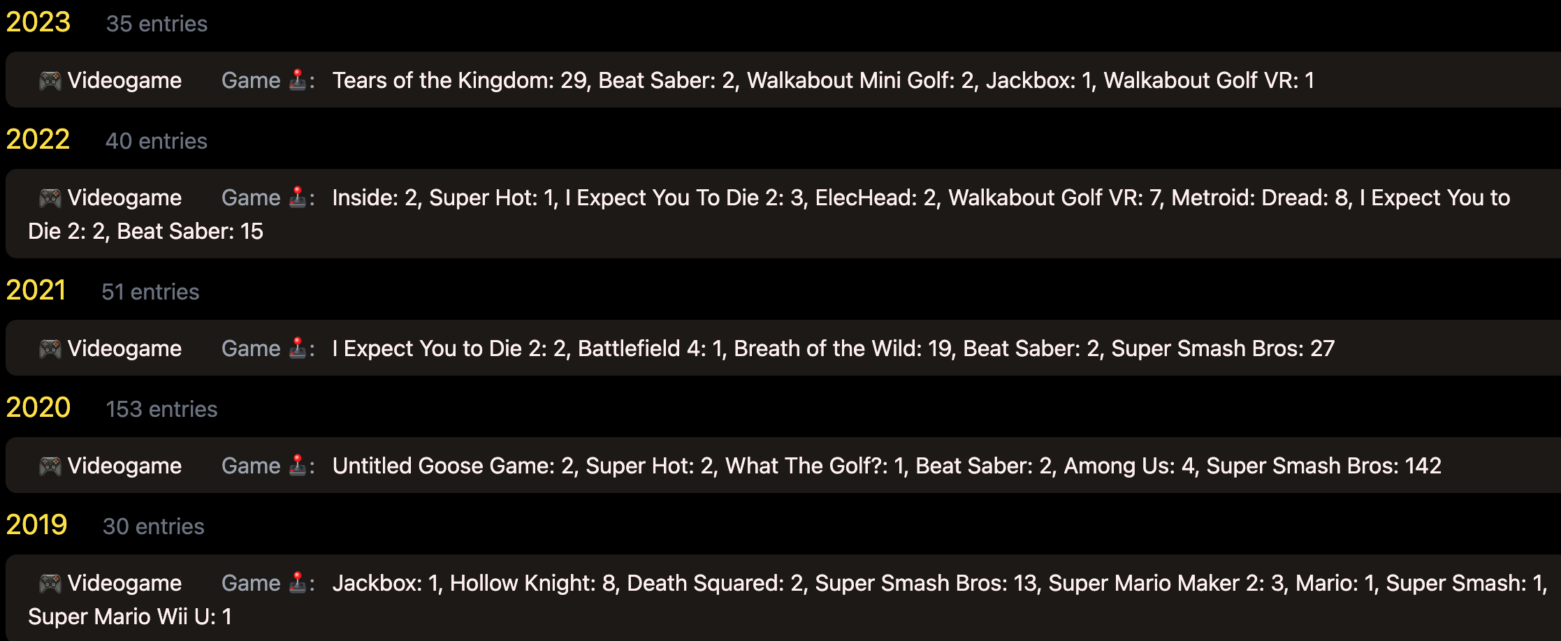 The only real takeaway here is that I play video games about 50 times a year, except when I started playing Super Smash Brothers online in 2020.