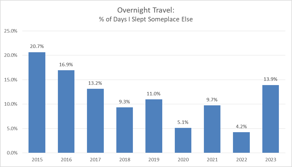 I track where I sleep each night as a proxy for travel. My phone wakes up at 3:30AM, pings my location & sends it to the cloud. For some reason, in 2022, I really stayed at home. That’s >20 days at home for every 1 day out. Crazy. Glad to see I’m trending up in 2023 - and the holidays haven’t even begun yet.