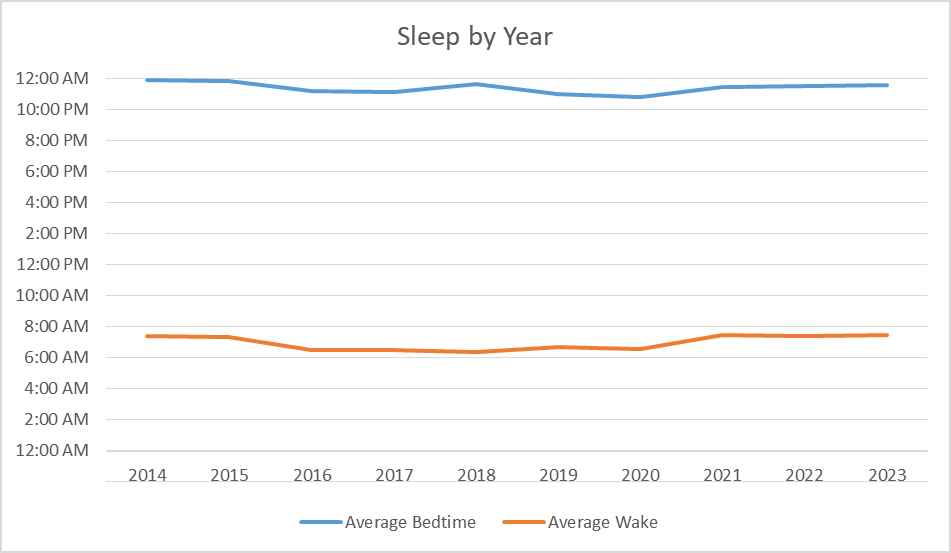 Honestly there’s not a ton to see here. My weight’s never been too dramatic. I included my min & max measures from each year to give a sense of range, but mostly cause otherwise this is a boring chart. Included because I figure most people would probably track this, so it would be a conspicuous absence.