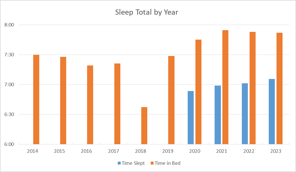 …since buying the Oura ring I’ve had access to time actually spent sleeping. This shows that, pretty consistently, don’t actually sleep for 45 minutes to 1 hour of the time I’m in bed. Interestingly, the birth of my first child corresponded with much less time in bed, but the birth of the second child corresponded with a permanent increase in my time spent in bed. Probably because two kids makes you tired.