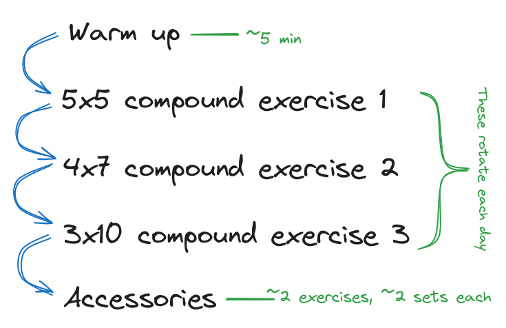 | Day | 5x5 Lift | 4x7 Lift | 3x10 Lift | Accessory Focus |