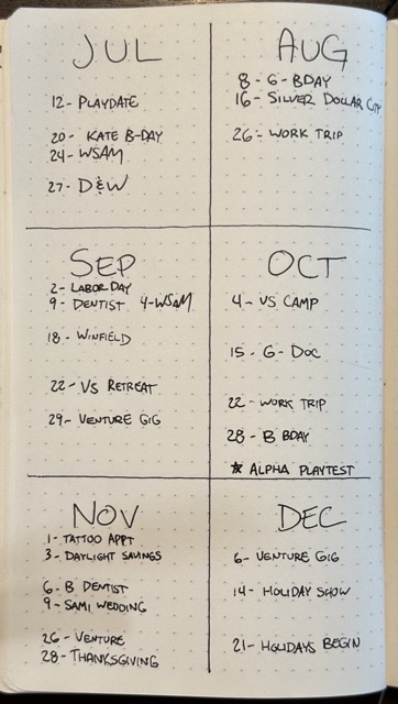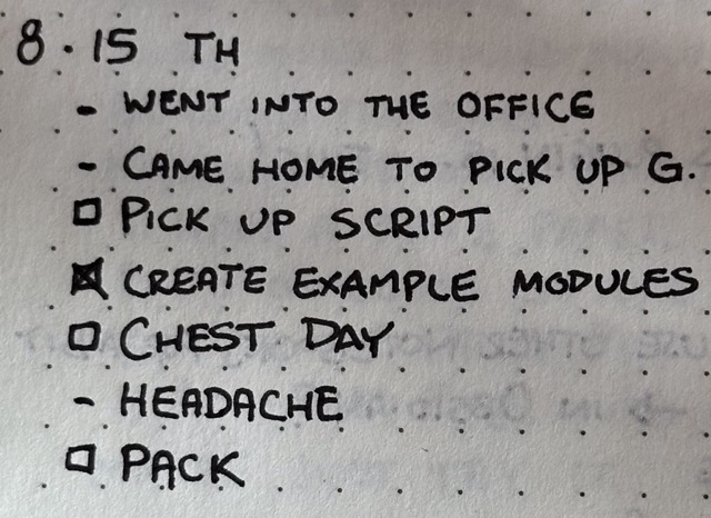 These take up the bulk of a “standard” Bullet Journal. They are a heading for a new day, and any little events, notes, observations, or tasks you pickup throughout the day. They are meant to be very economical in terms of letters written and info captured.