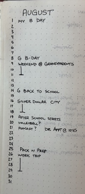 A monthly log is a list of the days of the month you’re in and whatever important things need to happen on that day. Things like a party you’re hosting, a doctor’s appointment, important deadlines - or other such things that fall out of the standard daily/weekly routine.