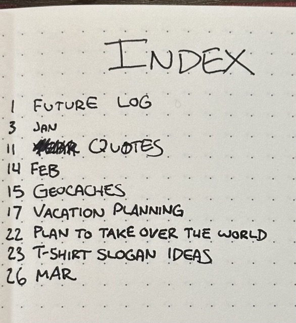 The index is usually the first few pages. It’s page numbers for Collections, Monthly Logs, and Future Logs. Daily pages don’t get indexed.