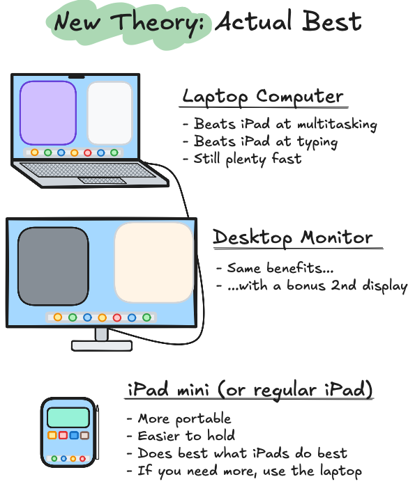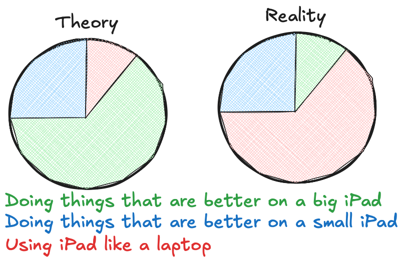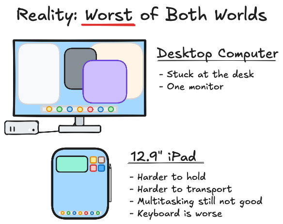 The theory I had was that a desktop with a big monitor was just a better experience than a laptop, and that the big iPad was just a better experience than a small iPad. That my use cases for needing the power of a computer on the go were minimal enough that I could either use the iPad directly to satisfy them - its screen is as big as a laptop anyway - or in a pinch I could use my iPad to remote into my desktop… and that’s what I do.