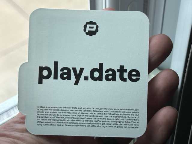 so steve is nervous nobody will know that’s a url, so just be clear, you know how some websites end in .com or .org, well they added a bunch of new ones like .condos or .focaccia or .ennui or whatever, and so our website actually ends in .date! that’s the real, actual url, play dot date. so believe it or not just type play.date and your browser will take you to our internet home page on the world wide web. now, one important note, the name of the handheld is just “Playdate”, one word uppercase P, please don’t think the device is called play dot date, that’s just the url, and yeah we tried to add a few words up there like “visit” or “go to our homepage” or “https://” but all of them looked kind of horrible, in conclusion we were really excited to get a clean url like play.date but as we’re laying out this sticker back art file we’re maybe feeling just a little bit of regret, not a lot. please visit our website. - The back of a sticker I received from the makers of the Playdate, in tiny print