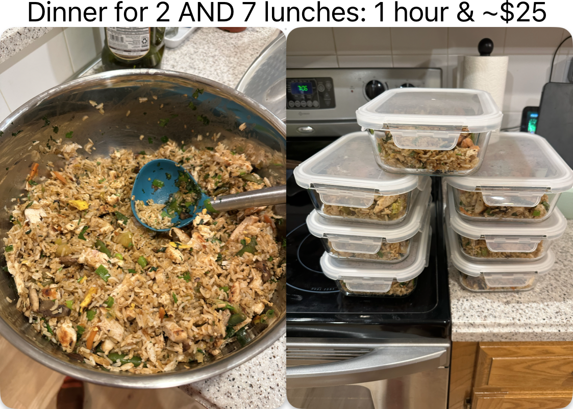 Amortizing the cost and time, on a per-meal basis, each of these stir fry meals took 7 minutes to create and cost $2.78. For comparison, my lunch today was Jimmy John’s, which took about 20 minutes & $15. So nearly 3x the time and more than 5x the cost.