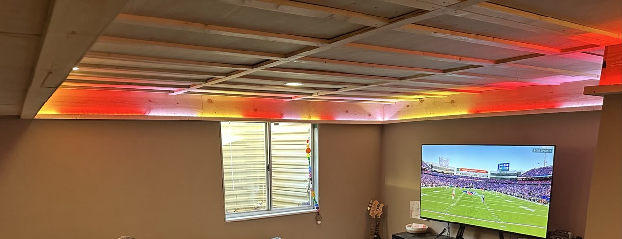 Our new house had a drop tile ceiling basement. I removed those and replaced it with a custom inset wood setup, including cove lighting. The project bought me back 10 inches of headroom in the basement and made it possible to have themed media nights.