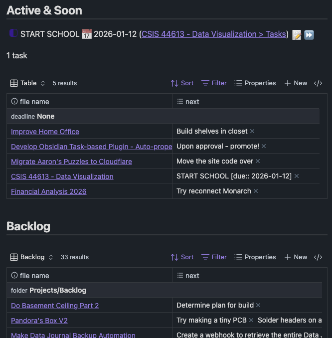 I finally have a project management dashboard that pays for itself. Instead of requiring manual updates, it’s powered by automated queries built to match my natural workflow within each project. I’m no longer maintaining a dashboard; I’m just doing my work, and the dashboard handles itself. It’s the most effective “things I could be doing right now” solution I’ve ever come up with.