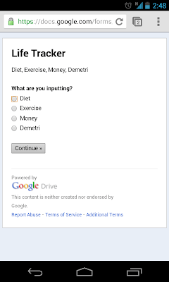 I have implemented the LTS using a Google Form and Spreadsheet with several associated custom-built scripts. The form is bookmarked and present on my main Android homescreen. It presents a single input interface for all four facets I’m tracking.
