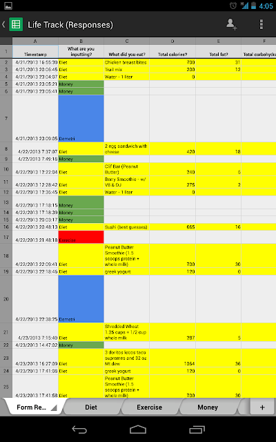 To remedy this, each time data is entered I have it sorted away automatically via a script I wrote. The script formats and copies the data over to one of the four summary sheets I built to represent each facet. The system works; and I’ve used it to its fullest extent for the past seven days. This is my life last week: