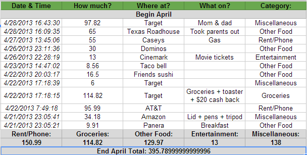 The motto today was brought to you by Albert Einstein. It will come into play later. Today is Monday. 7 days ago was a different Monday. On that Monday I started my project. I seek to educate you on my project, its goals, and how I’ve gone about trying to meet them. Life only seems to get more hectic as you get older. Kids have little responsibility until they get into school. In school you slowly have things added to your plate. Then you go to college and there’s a lot going on. After college comes real life, which is similarly challenging. Each stage gives you more and more to lose. Failure goes from getting a bad grade that doesn’t really matter, to getting a bad grade that might end up mattering, to all the possible ways you could mess up real life (going broke, getting sick, doing nothing with your life, etc). This is a problem. To solve this problem, I spent several years studying its true definition. You can’t actually define “life” and all of its potential pitfalls, but you can try. So I have been trying. Having a healthy fear of general failure, I have on several occasions thought “I need to keep track of things so I don’t wake up one day to find I’ve painted myself in a corner”. This was the nagging thought that spurred my Life Tracking System (LTS). The goal of the LTS is to audit my life in the four distinct areas I’ve determined have the greatest significance or impact. I want to track the following: Diet - Garbage in, garbage out. What you eat is what you are. Exercise - If you don’t use it, you lose it. Money - I’m spending how much on what?!? Demetri - My list of 25 things a “good” person would do every day. In doing so I hope to gain a greater sense of self, a greater handle on the important things in life, and use this knowledge to make intentional and positive changes in my life. I’ve tried doing something like this on several occasions in the past. The vast majority of them failed. Using those failures I’ve figured out what needed to be done for a system to be successful. I sought to make data entry as quick, efficient, and simple as possible. Beyond that, my goal was to have all the data manipulation and summaries performed automatically.