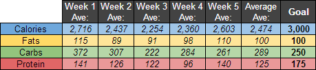 Diet results from month one I used 3 different online calculators to determine my goal caloric intake. 3000 was actually a step down from the average they suggested; and I can’t even get 2500 consistently. If you aren’t eating fast food or drinking soda, it’s hard to get more than 2500. I did manage to get 3700 on a few occasions, but never in a healthy manner (I LOVE pizza). I’m going to lower my goal some.