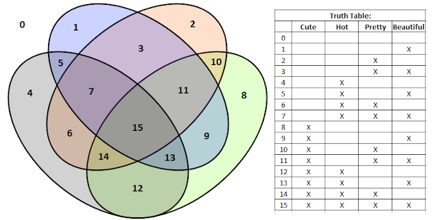 This is a still from 500 Days of Summer - one of my favorite movies of all time Side note on the relationship between the terms: I wanted to make a Venn diagram to show all possible combinations of attractiveness clearly; but it turns out that making a true Venn diagram with four categories gives you something really confusing-looking. Check this out -