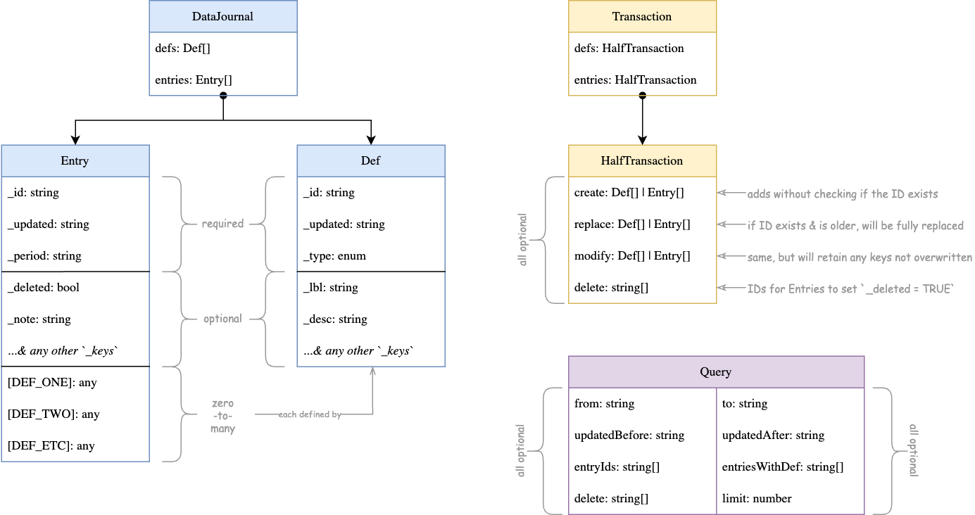DataJournalis comprised of an array ofEntrys and an array ofDefs- Metadata properties of elements (i.e.